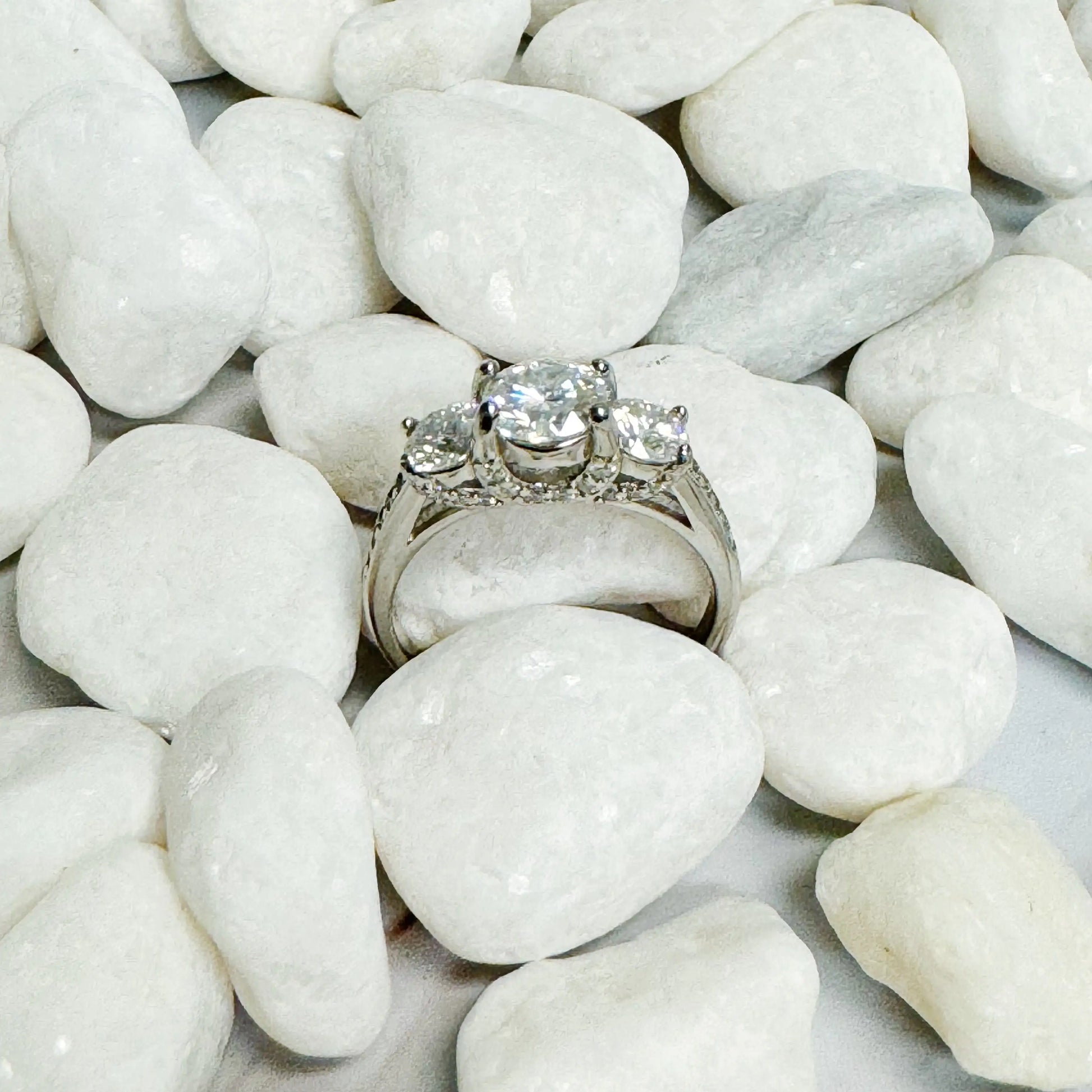 Create a lasting impression with the Three Stones Moissanite Ring. Featuring a striking 3 different sizes of moissanite stones set in a sterling silver setting, this ring is the perfect statement piece not overpowering. It's both luxurious and practical, making it a great choice for an anniversary ring or for travel.